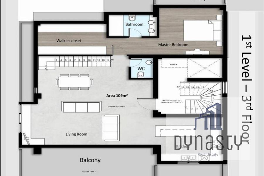 Third and forth Floor Apartment – 170.6 m², featuring a living room, kitchen, WC, and three master bedrooms, with the main master offering a large walk-in closet.
